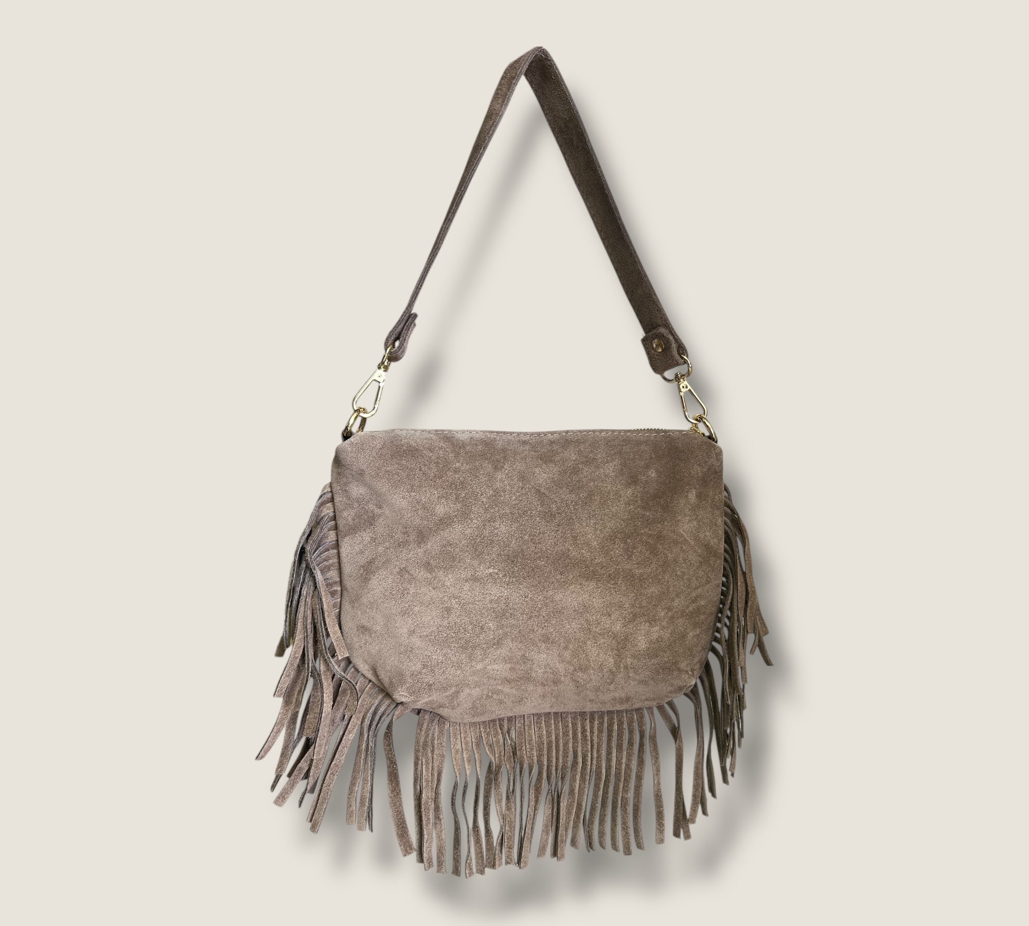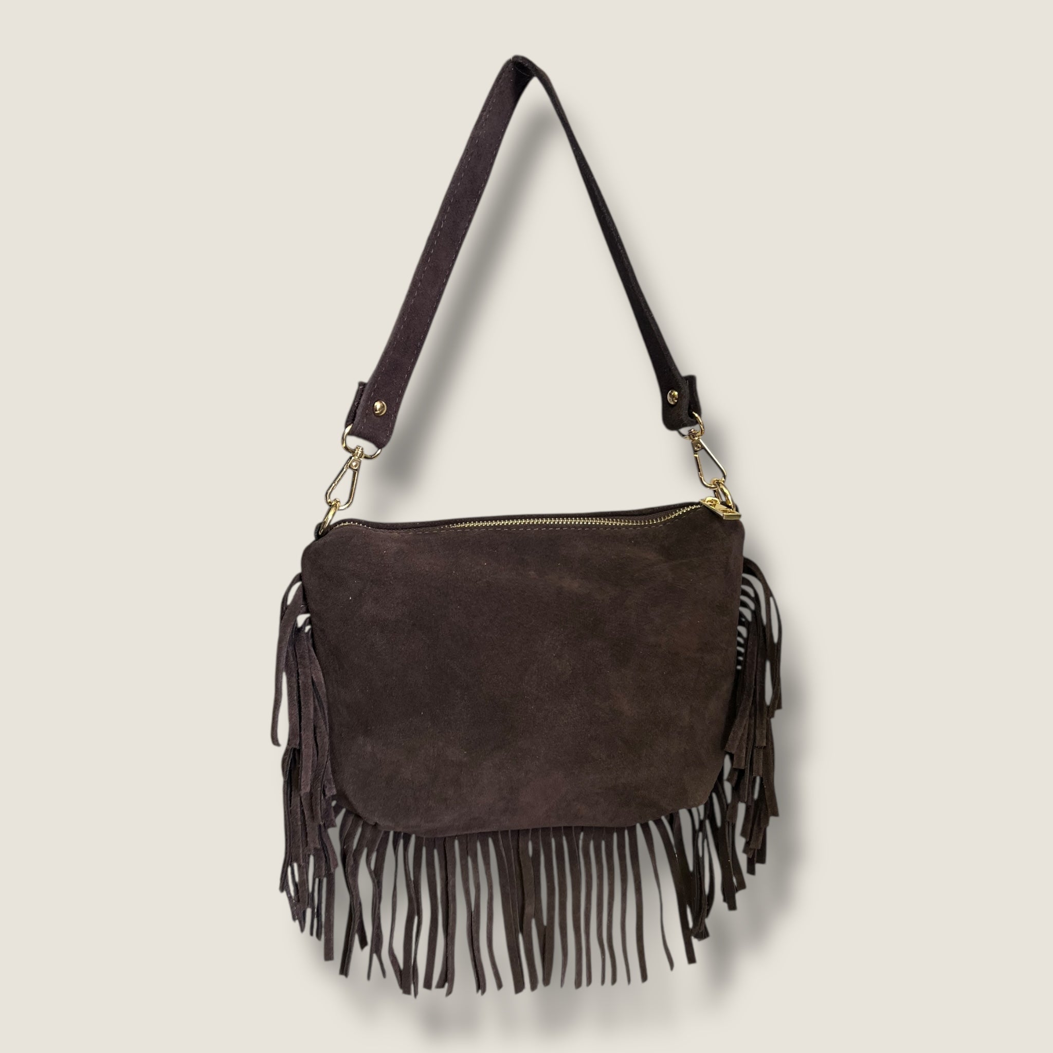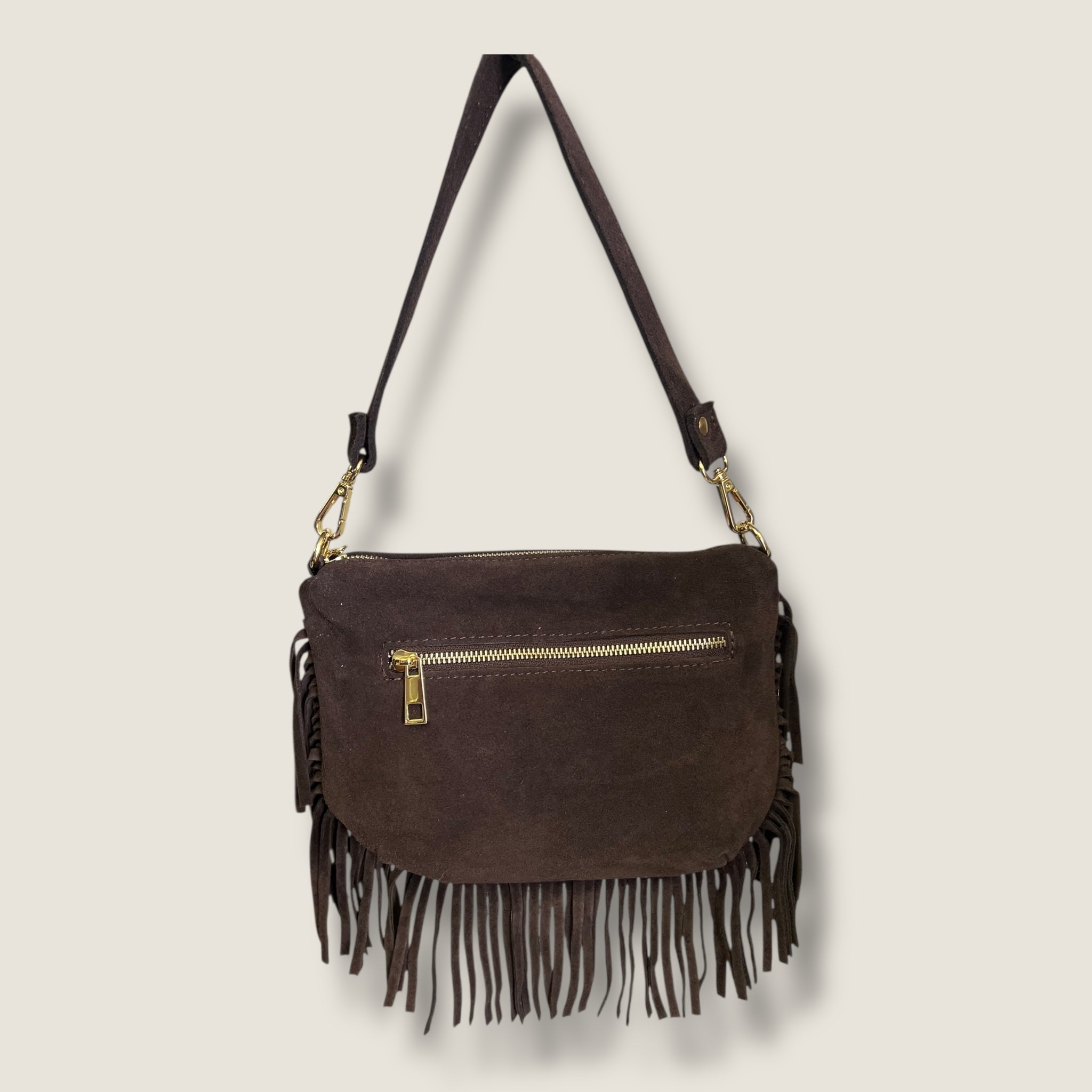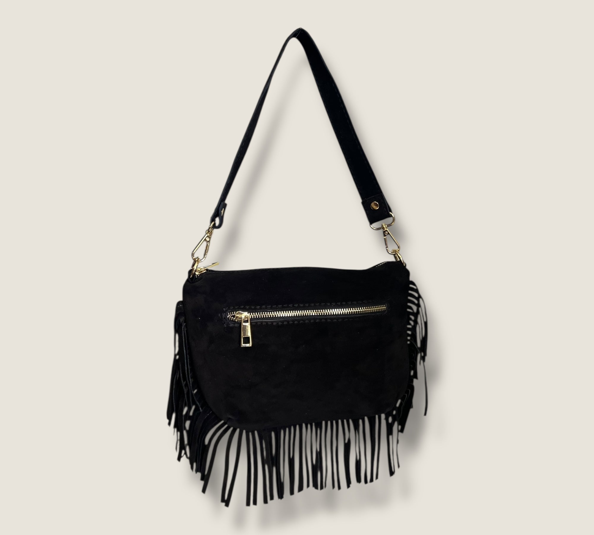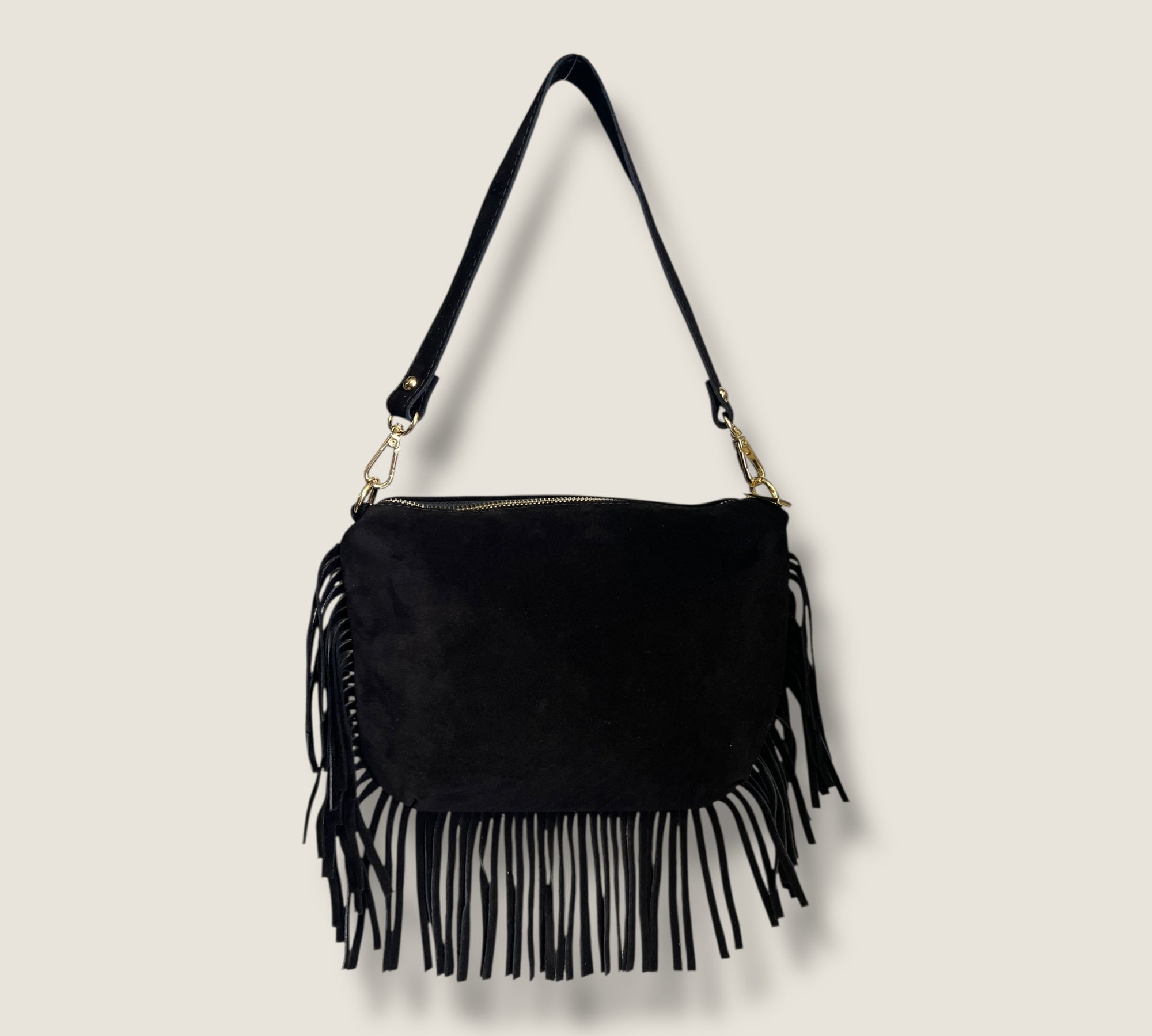 La Borsetta frangia Sara è una borsetta di moda che può essere indossata comodamente sulle spalle grazie alla tracolla in dotazione, Dotata di tasca interna, chiusura cerniera e comoda tasca posteriore con chiusura cerniera .Realizzata interamente in Italia, garantisce un look elegante e di tendenza. Ideale per completare il tuo outfit con stile e comfort