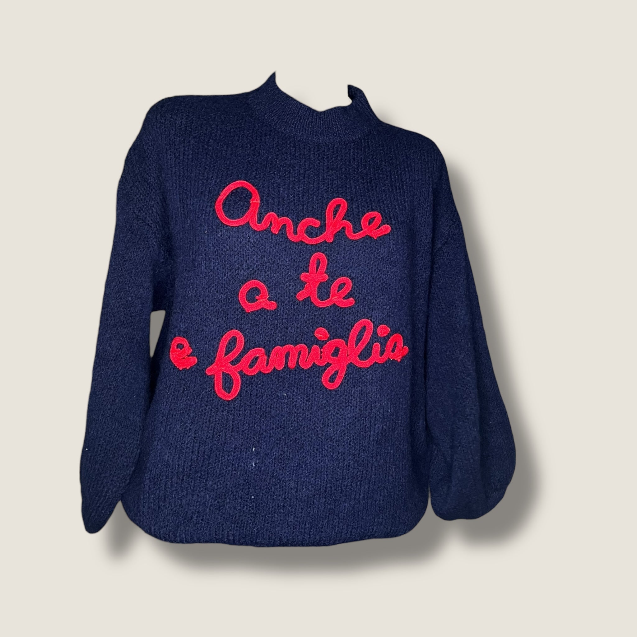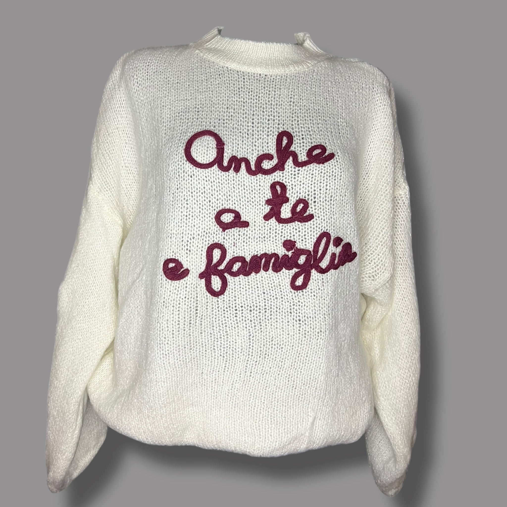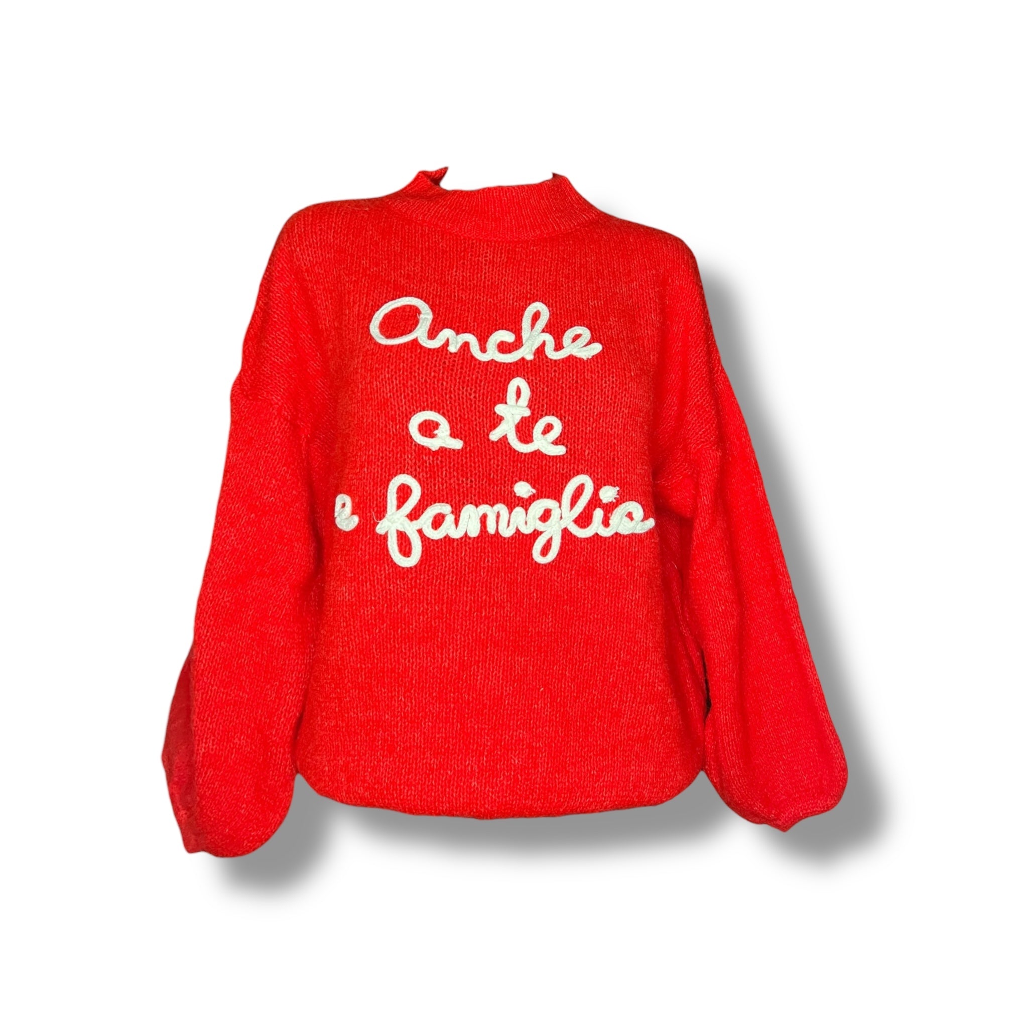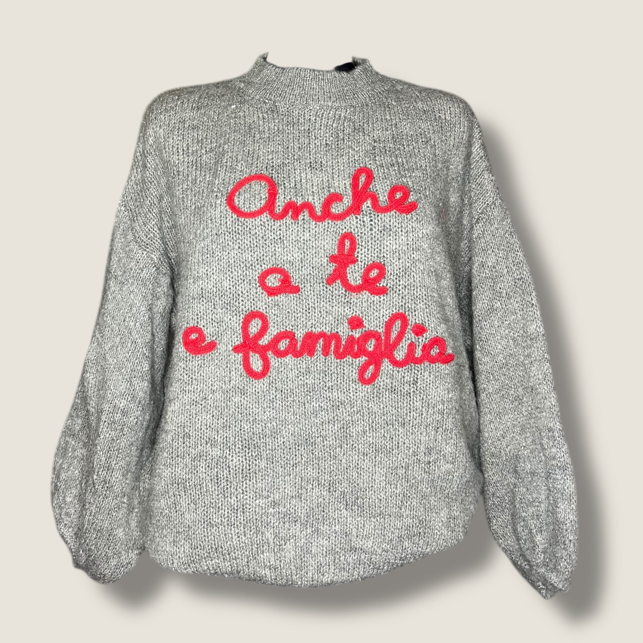 Il Maglioncino con la scritta ‘Anche a te e famiglia ' è il capo perfetto per un look caldo e alla moda. Realizzato in misto lana alpaca, è morbido e caldo, perfetto per le giornate più fredde. La taglia unica si adatta a diverse silhouette e il fatto che sia made in Italy garantisce qualità e stile. Affronta l'inverno con stile e comfort con questo maglioncino unico.